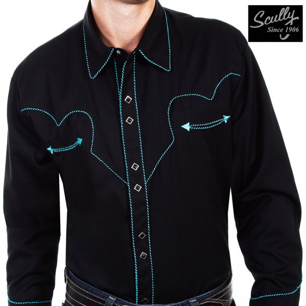 スカリー ウエスタン シャツ(長袖/ブラック・ターコイズキャンディケインパイピング)/Scully Long Sleeve Western Shirt(Men's)