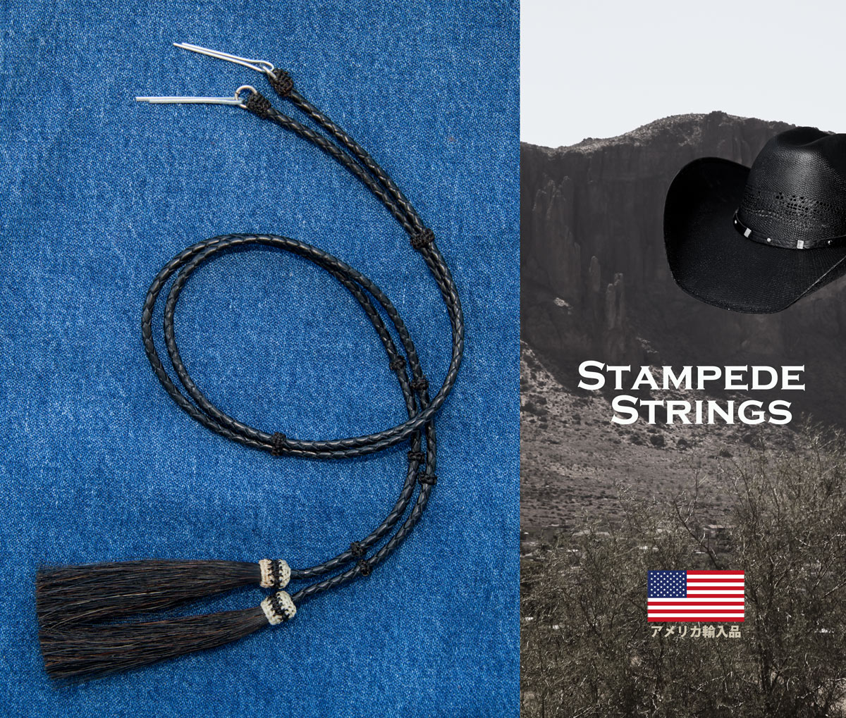 アメリカン ウエスタン レザー&ホースヘアータッセル スタンピード ストリングス ブラック・ブラック(ハット用あご紐)/Leather w/horse Hair Stampede Strings [SSLHBLKBLK102-Braided]