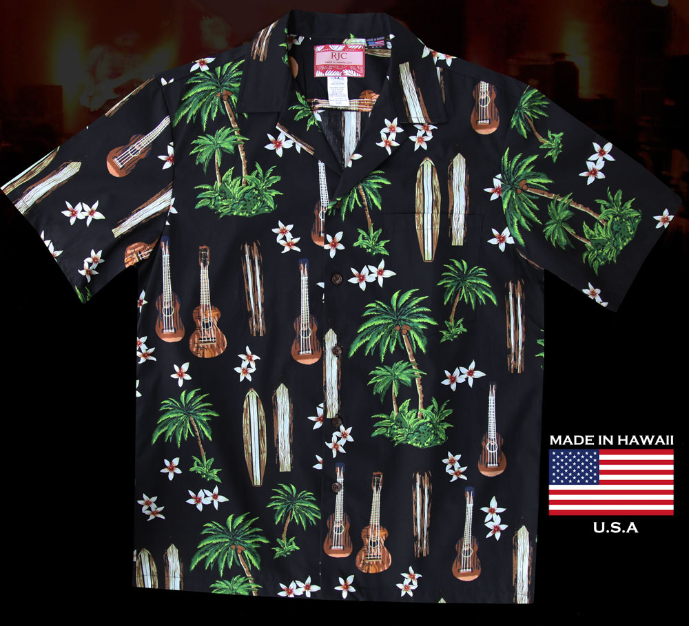 RJC ロバート・J・クランシー アロハシャツ ウクレレ・パームツリー・サーフボード(ブラック)/RJC ROBERT J. CLANCEY Aloha Shirt