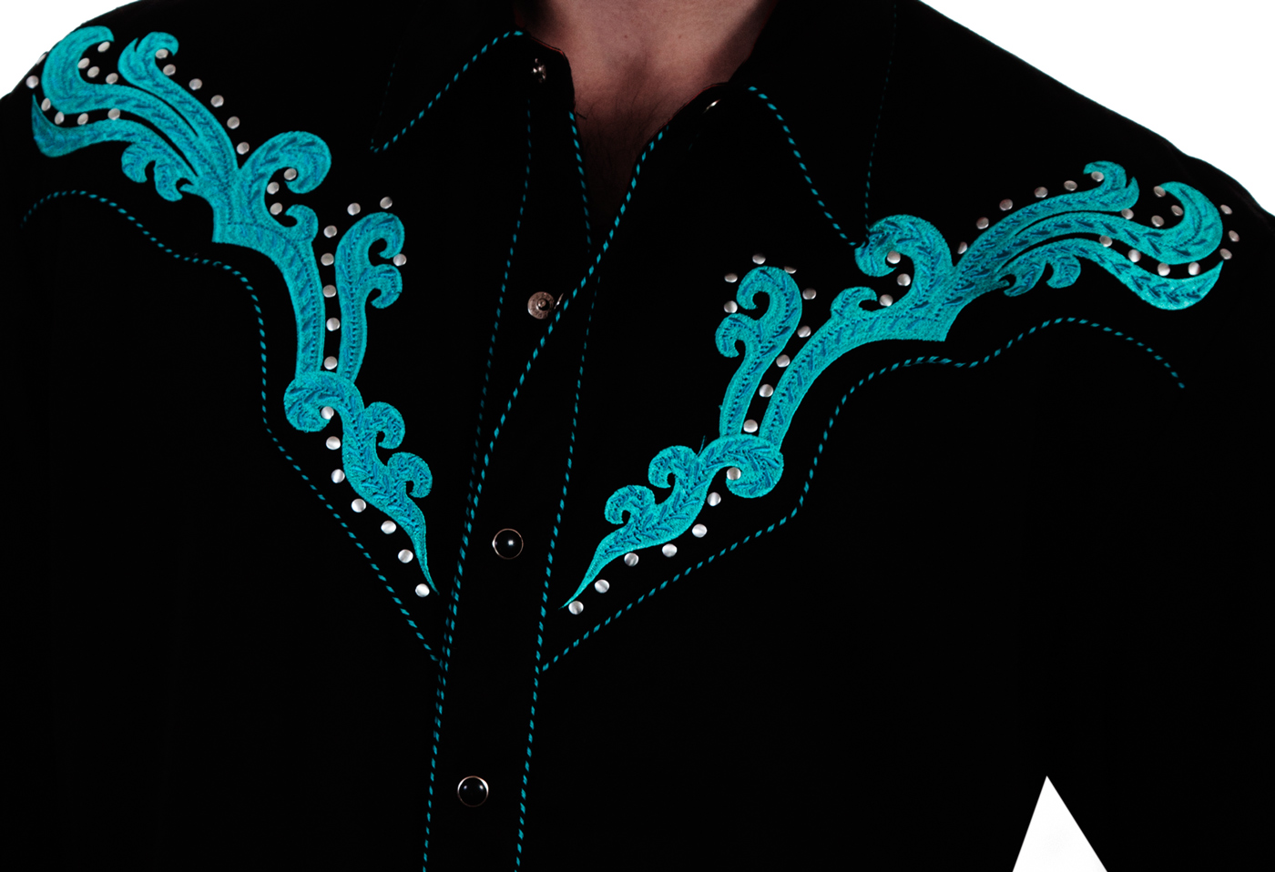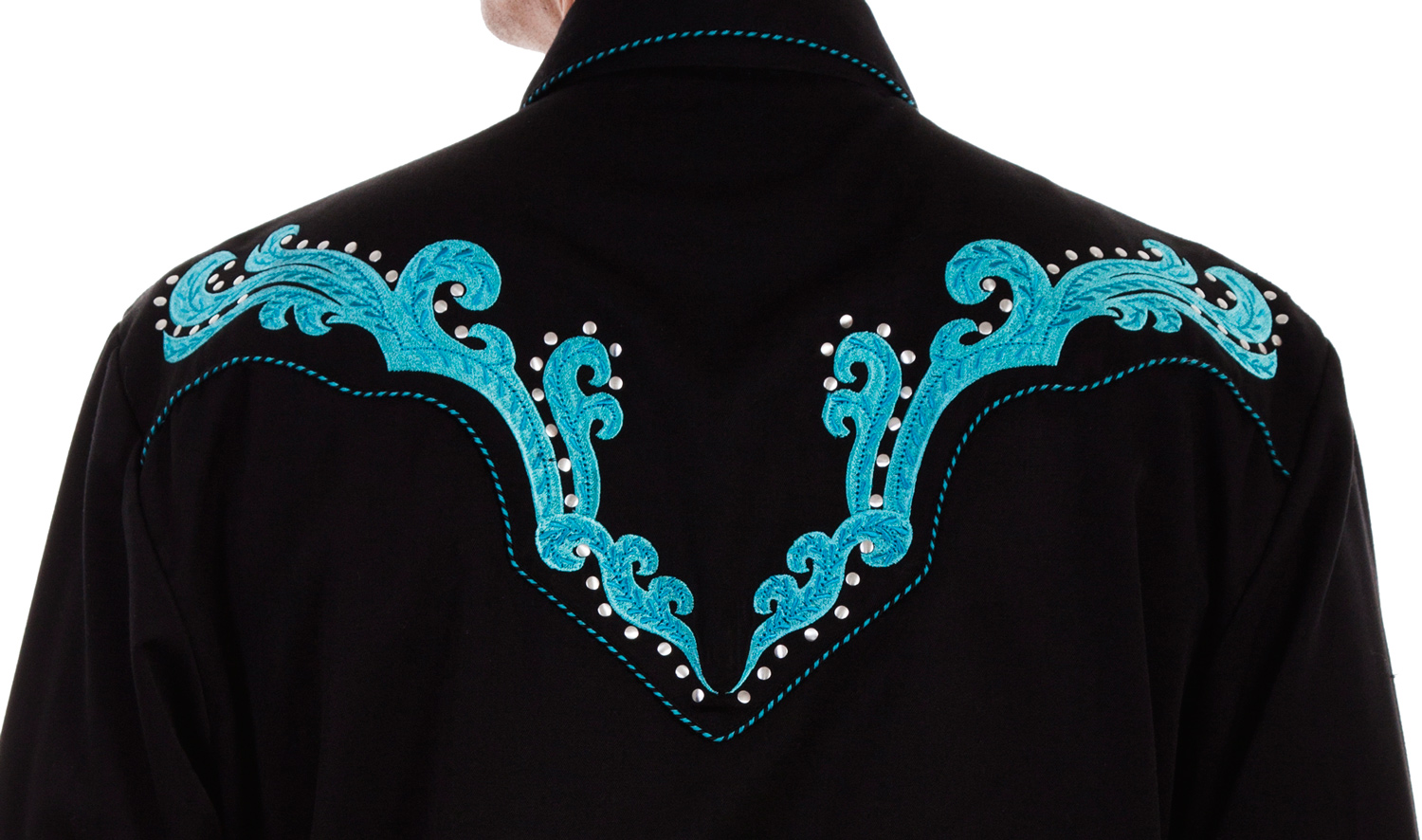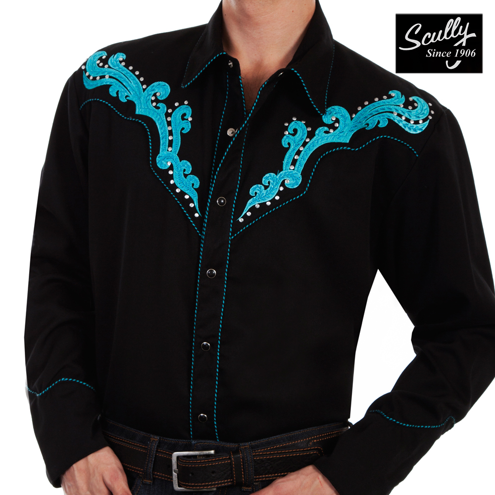 スカリー スクロール刺繍・メタルスタッズ・キャンディケイン ウエスタン シャツ(長袖/ブラック・ターコイズ)/Scully Long Sleeve Embroidered Western Shirt(Men's)