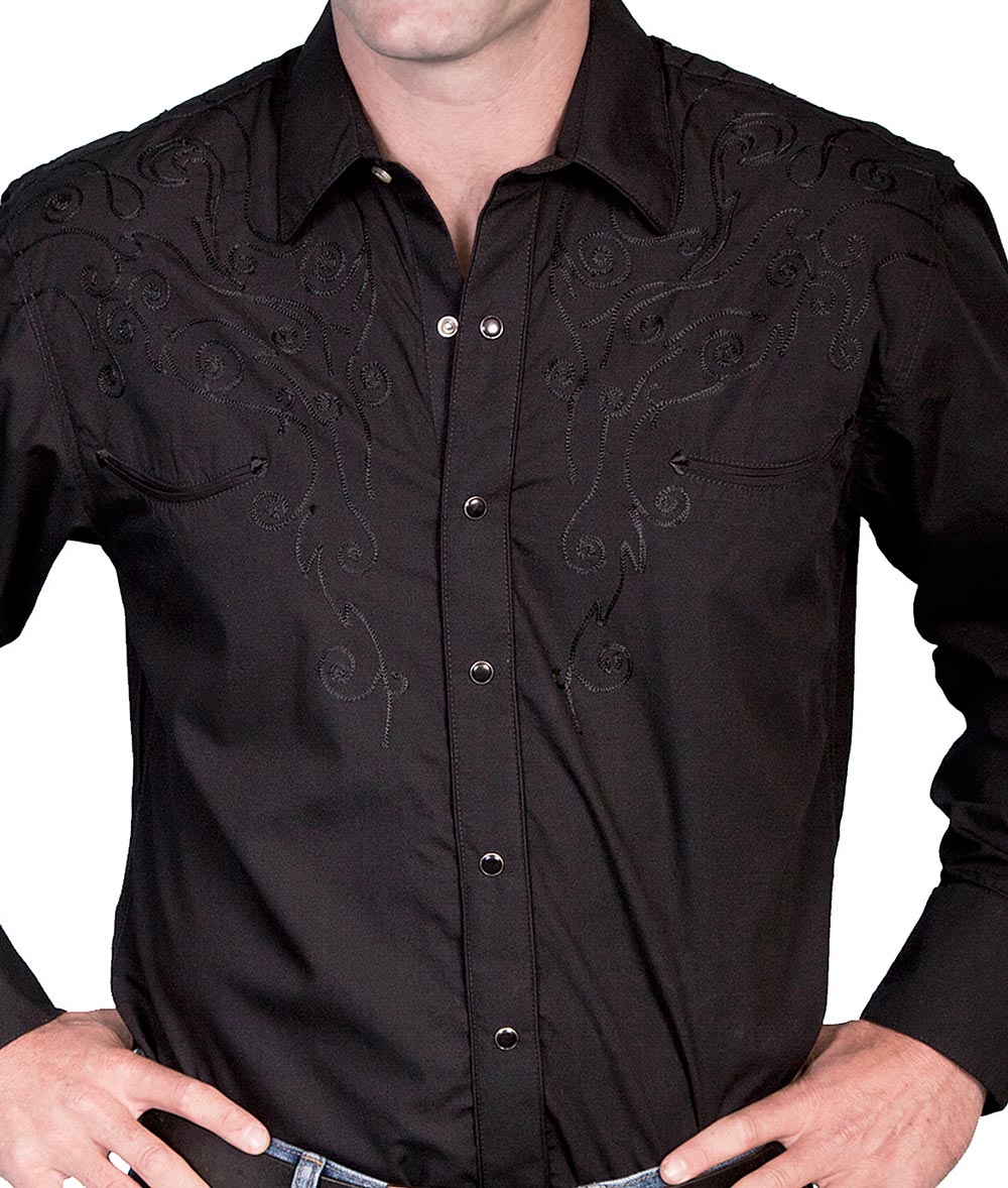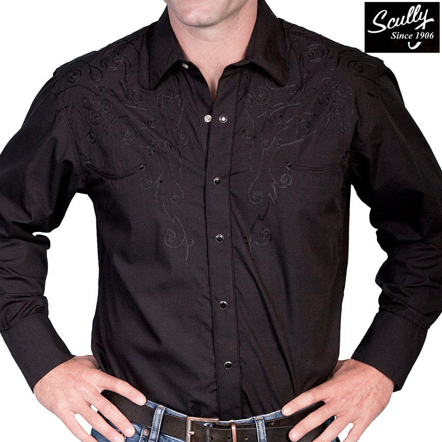 スカリー スナップフロント 刺繍 ウエスタン シャツ(長袖/ブラック・フロント&バック刺繍)/Scully Long Sleeve Embroidered Snap Front Shirt(Men's)