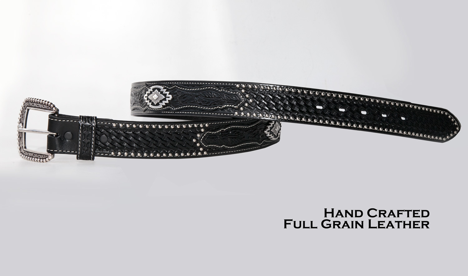 アリアット ウエスタン ベルト ハンドクラフト ブラックレザー &シルバー アズテックコンチョ/Ariat Western Leather Belt(Black/Silver)